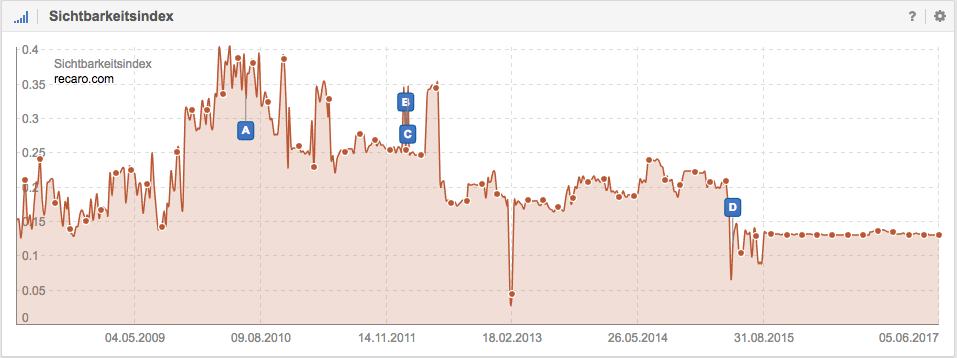 Entsprechend rankt die Website hauptsächlich für Keywords, die den Markennamen enthalten wie „recaro autositze“ und nicht für generische Keywords wie „autositze“ (ohne Markennamen). Wenig verwunderlich besitzt recaro.com bei Google in Deutschland daher auch nur eine bescheidene Sichtbarkeit von 0,13 Punkten. Der Sichtbarkeitsindex bewegt sich seit zwei Jahren in einem monotonen Seitwärtstrend. Die Rankings für die Marken-Keywords sind sicher und stabil. Für darüber hinausgehende Keywords kommt die Website alleine schon aufgrund der Gestaltung der Hauptnavigation nicht in Frage.