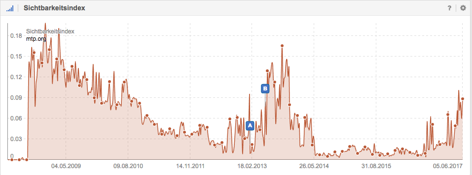 Auch MTP kann mit der internen Perspektive in der Navigation bei Google nicht punkten. Die Sichtbarkeit verläuft trotzt jüngster Anstiege in einem fallenden Trend seit dem Jahr 2008.