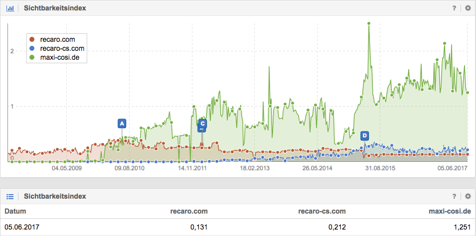 Fairerweise möchte ich erwähnen, dass es für die beiden Geschäftsfelder Auto- und Kindersitze auch noch die Websites recaro-automotive.com (0,27 Punkte Sichtbarkeit) und recaro-cs.com (0,21 Punkte Sichtbarkeit) gibt. Aber allein diese Aufteilung in mehrere Domains ist nicht unbedingt nutzerorientiert. Es besteht die große Gefahr, dass die Nutzer auf der falschen Domain landen und sich dort nicht abgeholt fühlen. Wie die folgende Grafik zeigt, erreichen Wettbewerber wie maxi-cosi.de (1,25 Punkte Sichtbarkeit) ein Vielfaches der Sichtbarkeit bei Google.