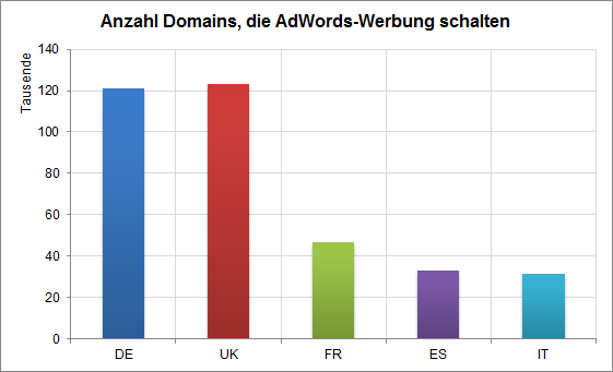 Ging es bei dem Blick auf die wichtigsten europäischen Onlinemärkte im ersten Teil um SEO-Kennzahlen, möchte ich heute Daten aus dem AdWords-Bereich der SERPs zeigen. Wie auch beim ersten Beitrag, basieren die Auswertungen auf jeweils 1 Millionen Keywords pro Land und liefern durch die Auswahl dieser Keywords repräsentative Zahlen. Los geht es mit einem Diagramm, das die Anzahl unterschiedlicher (Target)-Domains in den fünf Ländern auflistet: