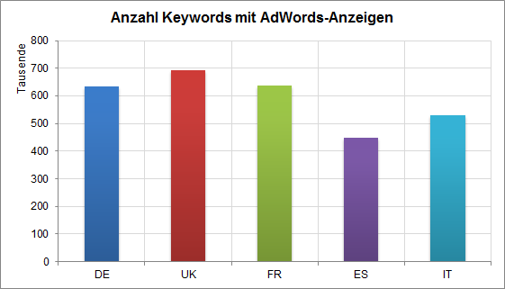 Ähnlich wie im SEO-Bereich gibt es auch hier eine Zweiteilung der größten europäischen Werbemärkte: während Deutschland und England zusammen vorne liegen, folgen Frankreich, Spanien und Italien mit einigem Abstand. So schalten laut dieser Daten in Deutschland rund vier Mal mehr Domains (dieser Wert dürfte auch grob mit der Kundenzahl gleichzusetzen sein) Werbeanzeigen neben den organischen SERPs als in Italien. Das Verhältnis zwischen Deutschland und Frankreich liegt immer noch bei 1:3. Um das etwas weiter auszuwerten, stellt das folgende Diagramm die Anzahl der Keywords aus dem Set von einer Millionen Keywords dar, bei denen mindestens eine Anzeige zu finden ist: