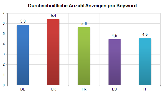 Hier sind die Unterschiede überraschenderweise nicht mehr ganz so deutlich. Frankreich hat sogar mit Deutschland gleichgezogen, England bleibt weiterhin auf dem Spitzenplatz. Etwas abgeschlagen mit rund 44% an Keywords mit Anzeigen liegt Spanien auf dem letzten Platz. Die nächste Auswertung stellt die durchschnittliche Anzahl der Anzeigen pro Land dar: