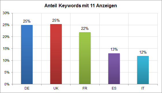 England weiterhin auf dem Spitzenplatz und auch die weiteren Daten ähneln naturgemäß recht denen des vorherigen Diagramms. Die letzte Auswertung zeigt den Anteil der Keywords, die 11 Anzeigen auf der ersten Seite haben, also 3 über den organischen SERPs und 8 daneben. Ich denke, dass dies ein guter Indikator dafür ist, dass dieses Keywords recht stark umkämpft ist und sich dieses folglich auch in den zu zahlenden Klickpreisen widerspiegeln wird: