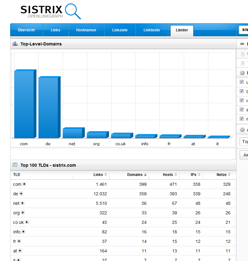 In den weiteren Reitern der OpenLinkGraph Beta gibt es zusammenfassende Auswertungen zu den Hostnamen der Domain, auf die gelinkt wird, zu einzelnen URLs, zu Linktexten, zu Top-Level-Domains sowie zu Ländern. Bei jeder dieser Auswertungen wird die komplette Anzahl der gefundenen Links sowie die Host-, Domain-, IP- sowie Net-Pop angezeigt. Auch sind diese Listen nach diesen 5 Kriterien sortierbar. Soviel erst mal als kurzer Einblick in den aktuellen Stand, im nächsten Blogposting schreibe ich dann etwas zu der Indexgröße sowie Vergleiche zu anderen Anbietern.