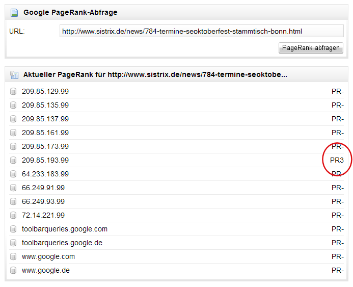 Gestern Mittag noch geschrieben, dass es mal wieder an der Zeit wäre, schon liefert Google das passende PageRank-Update unverzüglich nach. Aktuell sehe ich auf noch recht wenigen (zum Beispiel 209.85.193.99) und auch sehr sprunghaften (teilweise waren bis zu 10 Abfragen nötig um die neuen Werte zu sehen) Datencentern neue Werte, bin mir aber sicher, dass sich das wie üblich schnell verteilen wird und der neue PageRank-Wert dann auch via Toolbar sichtbar ist. Wem das zu lange dauert, der kann bei unserer Onlineabfrage nachsehen; die ersten Abfragen sind jetzt auch ohne Anmeldung möglich.