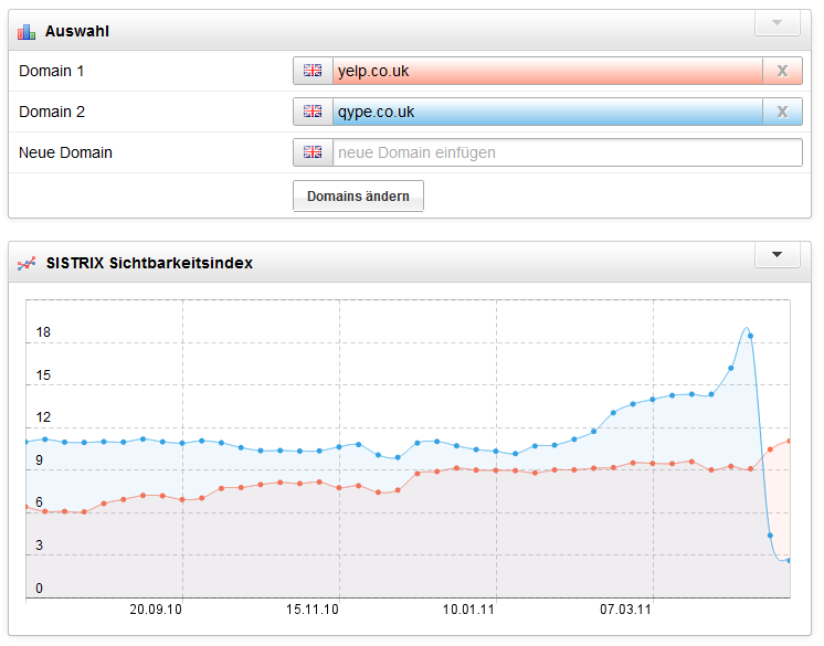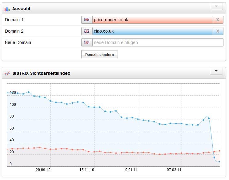 Auffällig, dass Yelp hier bei diesen Metriken durchgehend besseren Werte erzielt. Auch bei vergleichbaren „Domain-Paaren“ (eine durch Panda betroffen, eine andere Domain nicht), habe ich häufig deutliche Unterschiede in diesen Kennzahlen gesehen. Hier zum Beispiel für Pricerunner.co.uk sowie Ciao.co.uk: