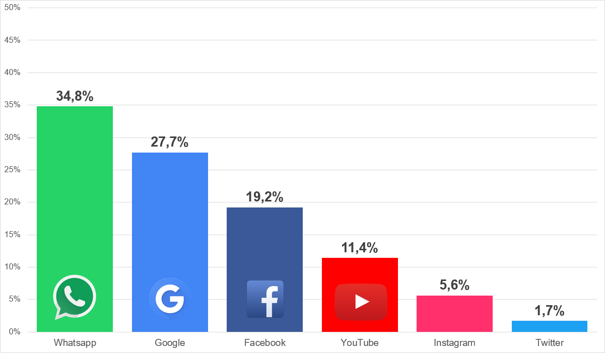 Hier ist es noch deutlicher: Whatsapp ist absolut führend in der täglichen Nutzung, während Facebook stark abfällt. Aus dem Google-Universum rangieren die Websuche und YouTube bei der empfundenen, täglichen Nutzung in etwa auf gleichem Niveau.