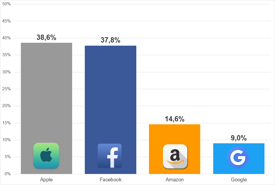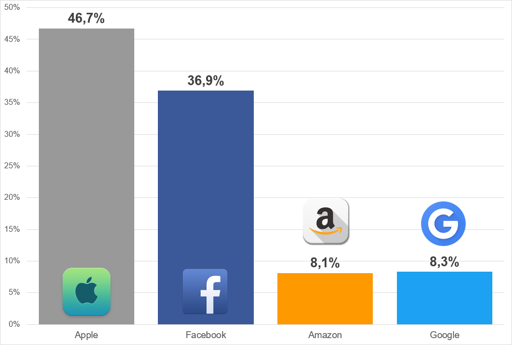 Die Frage nach der empfundenen Nutzung ist eine Sache, deutlicher wird die relative Wichtigkeit der vier großen Firmen (Google, Amazon, Facebook, Apple) aber, wenn man ihre Nutzer danach fragt, auf welche Firma sie zuerst verzichten würden: