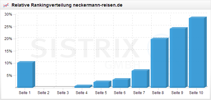 Um keinen kleinen Webmaster zu verärgern, habe ich hier mit spardeingeld.de eine Domain genommen, die auch regelmäßig in meinem IndexWatch auftaucht. Die werden es entweder wissen oder können hier etwas lernen. Auffällig ist, dass nahezu keine Keywords auf den Positionen 1-50 gefunden werden – erst danach gibt es einen starken Anstieg bist zur zehnten Seite. Diese Verteilung ist somit ein Spiegelbild der Verteilung einer Seite, die super rankt und in meinen Augen ein guter Indikator dafür, dass die Domain einer Google-Penalty unterliegt. Eine interessante Abwandlung der Verteilung ergibt sich, wenn es sich bei dem Domaininhaber und -Namen um eine starke Marke handelt. Hier neckermann-reisen.de: