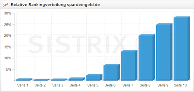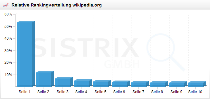 Für einen Teil der SISTRIX Toolbox werden regelmäßig die ersten 10 Ergebnissseiten von rund einer viertelmillionen Keywords abgefragt. Neben so spannenden Sachen wie der Verfolgung von Rankingentwicklungen oder der Berechnung des Sichtbarkeitsindexes kann man mit diesen Daten auch auswerten, auf welchen Ergebnisseiten die Treffer einer Domain eigentlich gefunden werden. Das ergibt neben der Möglichkeit einer toller Flashanimation häufig auch einen ersten Eindruck davon, wie „gesund“ die jeweilige Domain eigentlich ist. Im Normalfall sollte das ein Ergebnis wie dieses hier der Uni-Bonn ergeben: 10 Ergebnisseiten und die Verteilung der Rankings auf diese ist ungefähr gleichmäßig. Interessant sind nun Abweichungen von diesem Muster. Wer in etwa die Klickrate in Abhängigkeit von der Position im Kopf hat, weiß, dass diese extrem schnell abnimmt – ab der dritten Seite sind Besucher schon eher Zufall. Ein schönes Beispiel für eine perfekte Verteilung bietet da – wer hätte es auch anders erwartet – Wikipedia: mit über 50 Prozent aller gefunden Keywords steht die Enzyklopädie auf der ersten Seite. Um wieder auf das Thema Penalties zu kommen, hier die typische Verteilung einer Seite, von der ich glaube, dass sie eine Google- Penalty hat: