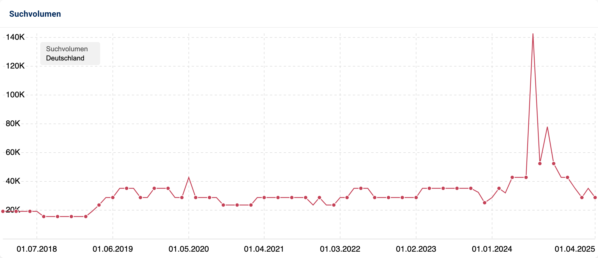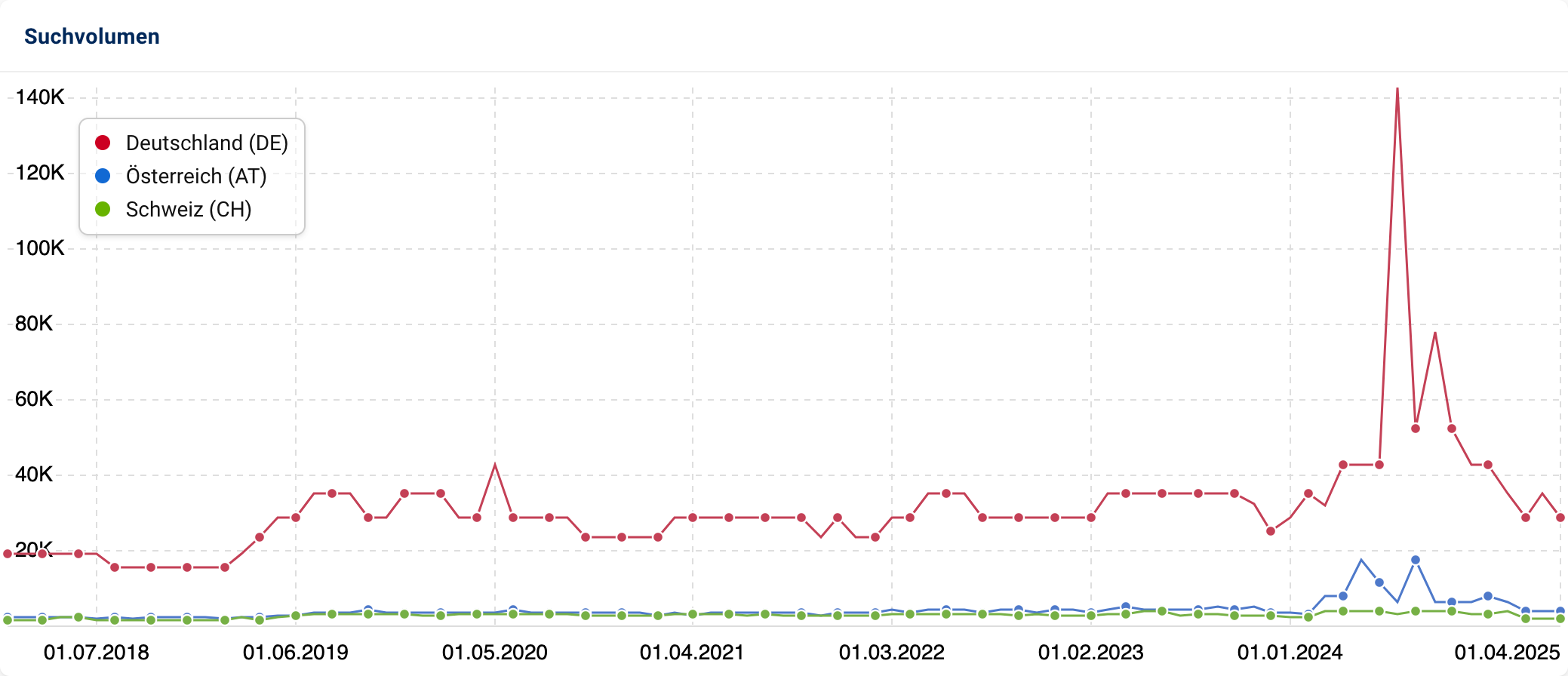 Saisonal sind die Suchen, abgesehen von dem sichtbaren Peak in 2024, nicht so schwankend, wie der eingangs genannte Bier-Konsum und bei weitem nicht so erkennbar wie z.B. bei den SectorWatches zu Grills, Rasenmähern oder Winterreifen. Spannend ist zudem, dass Österreich und die Schweiz keinen besonderen Anstieg in dieser Zeit zu verzeichnen hatten.