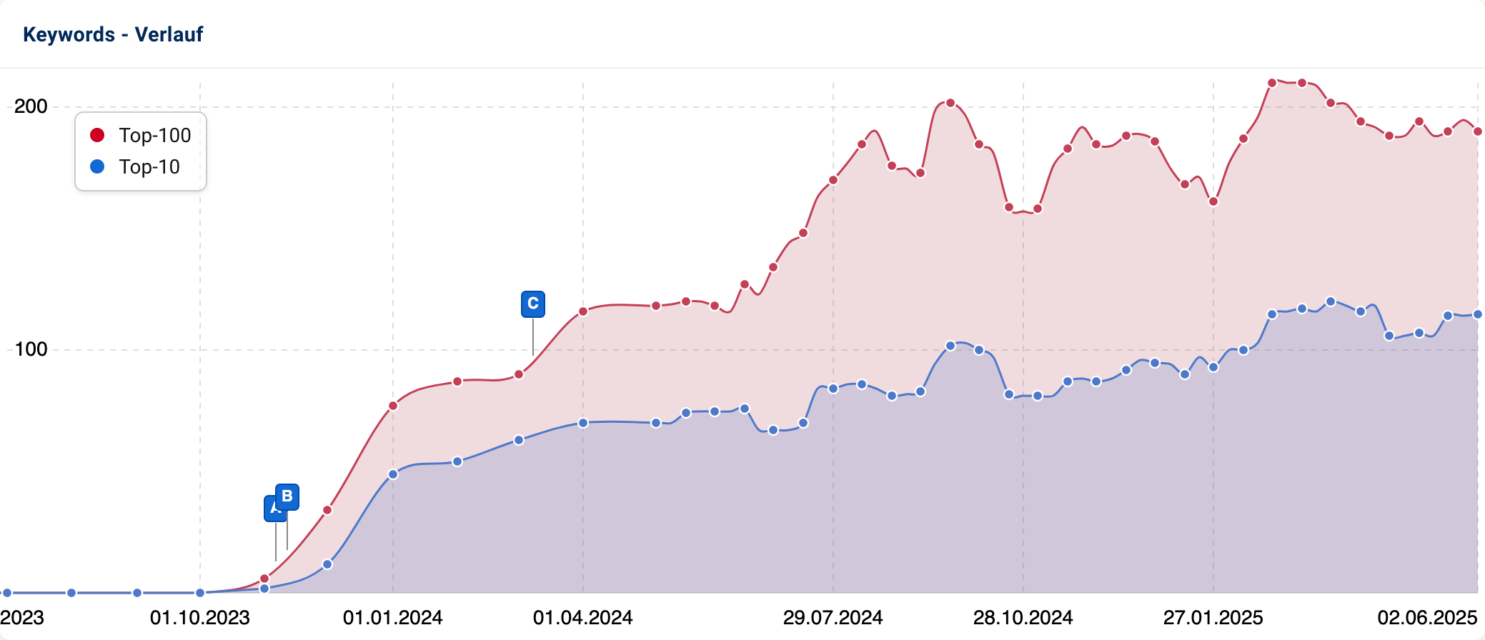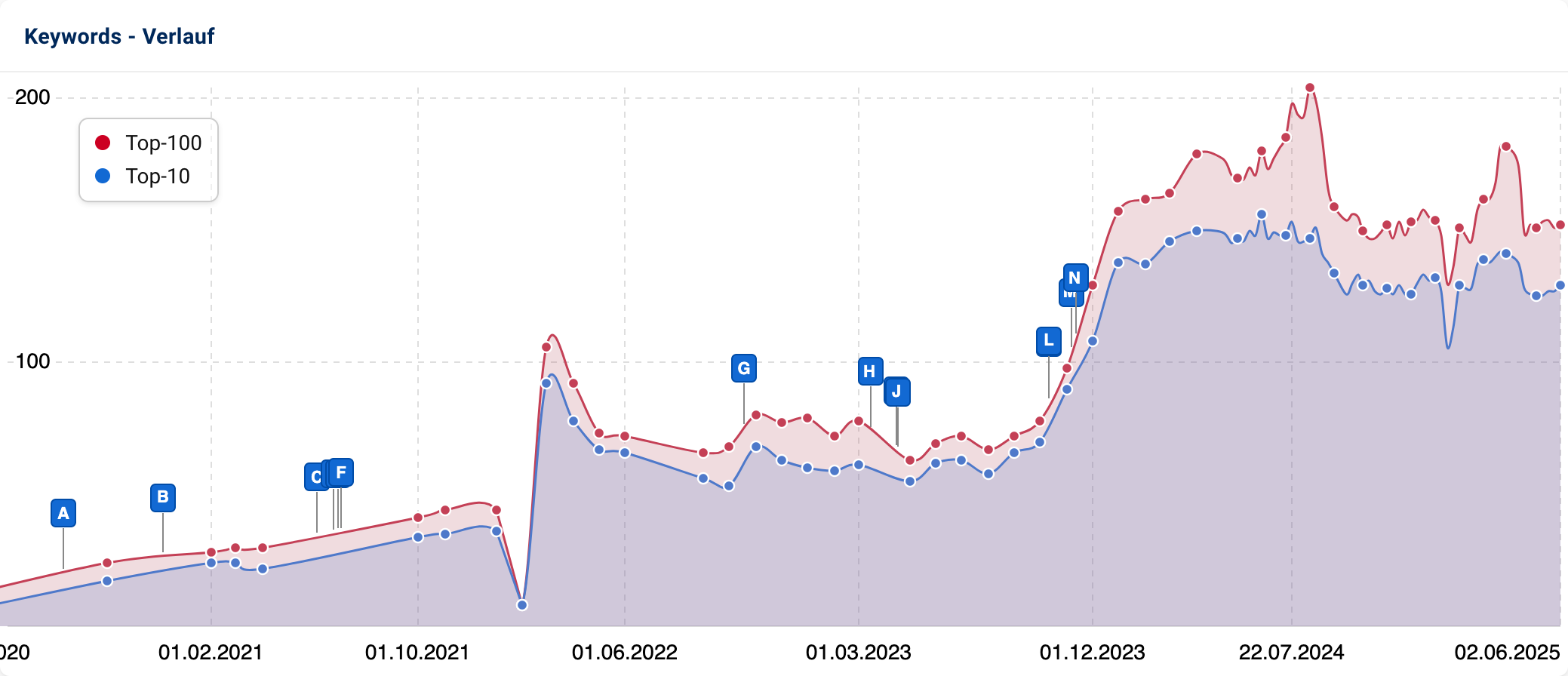 Dieser schafft es mit 46 Keywords in die Top 100 und mit genau der Hälfte davon sogar in die Top 10.