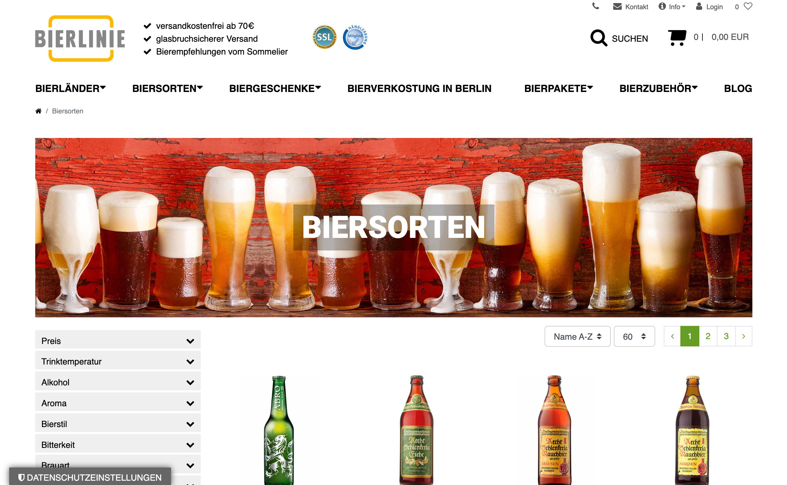 Die Startseite stellt das Produkt und Persönlichkeit in den Fokus und macht einen frischen Eindruck. Fokusthemen sind Biere aus aller Welt, Biersorten (4.150) und auch Biergeschenke. Das stärkste Verzeichnis ist dabei die Biersorten-Kategorisierung, die wir uns im Folgenden näher anschauen werden.