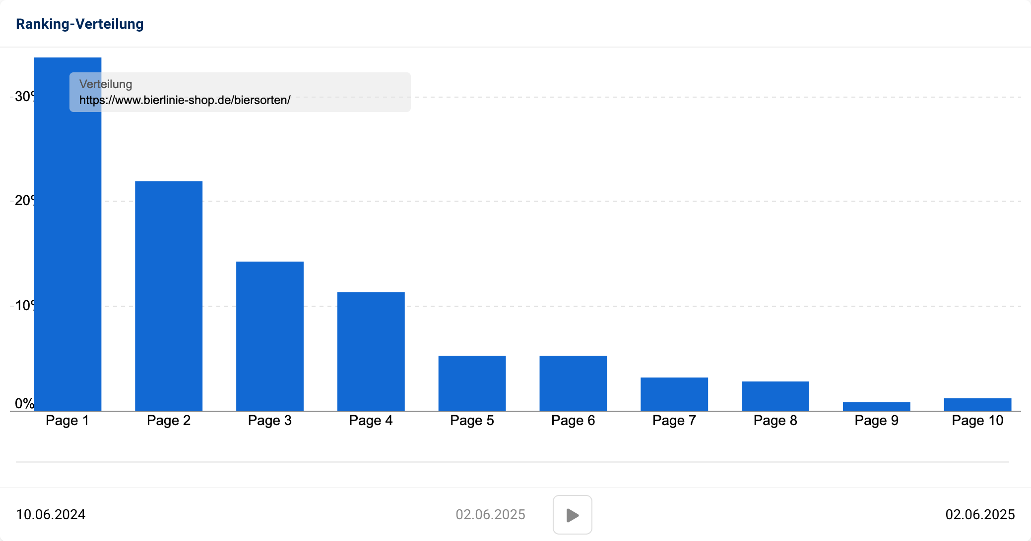 Insgesamt schafft es diese URL mit 129 Keywords in die Top-10 und ist mit insgesamt 152 Keywords in den Top 100 platziert. Und ja, dies entspricht 85% Top-10 Platzierungen mit dieser URL. Zudem sind mehr als ein Drittel (56%) der Keywords auf Rang eins platziert.