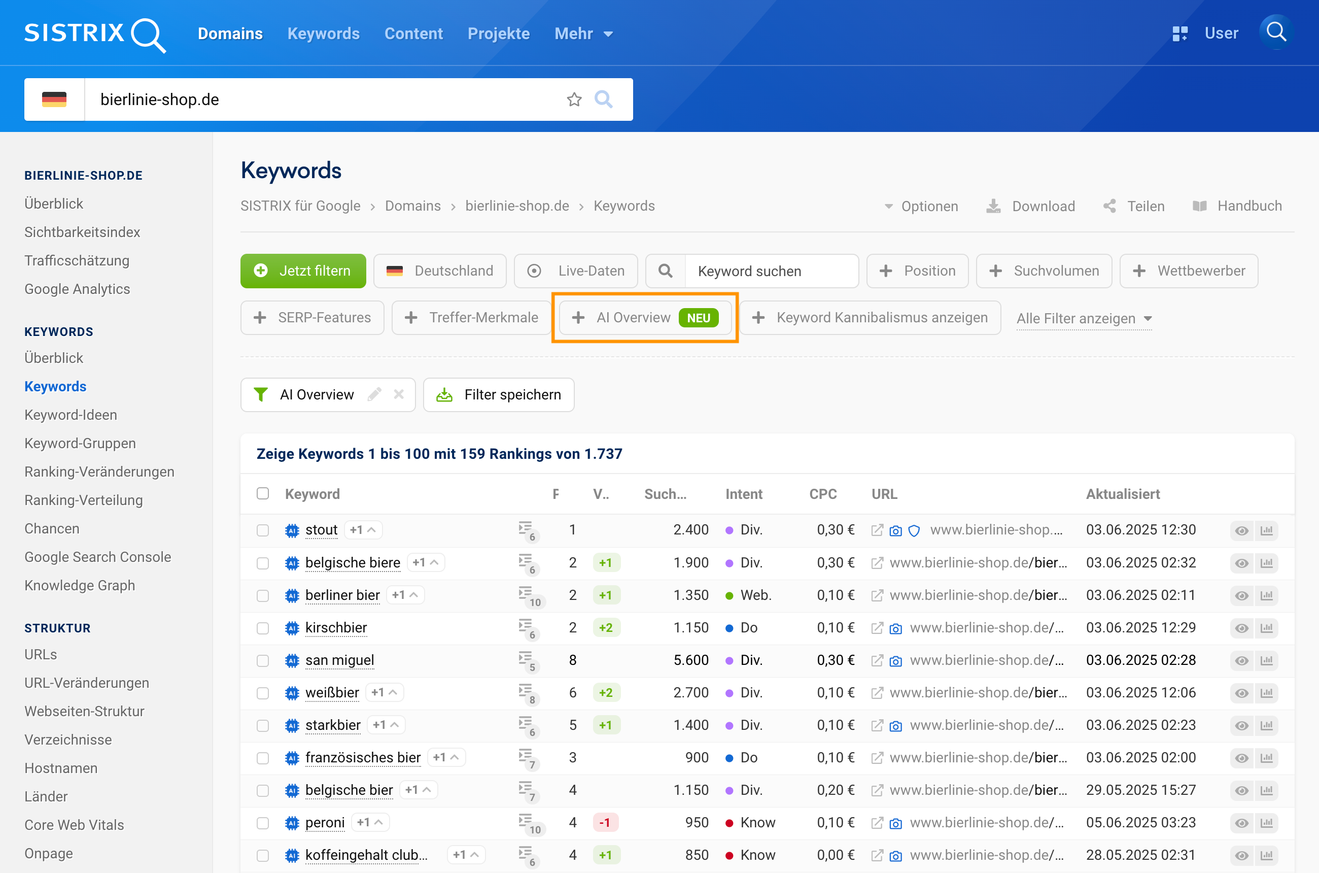 Insgesamt rankt der Shop mit fast 15.000 Keywords und platziert sich damit relativ breit in diesem speziellen Bereich. Davon sind über 10% (1.564) auf AI Overviews zurückzuführen.