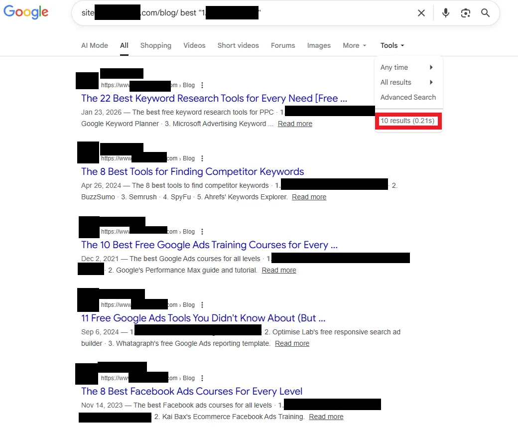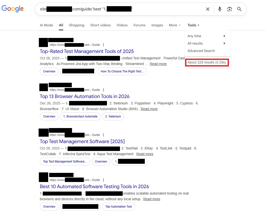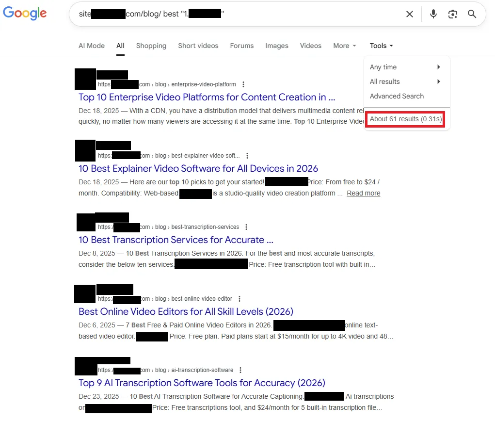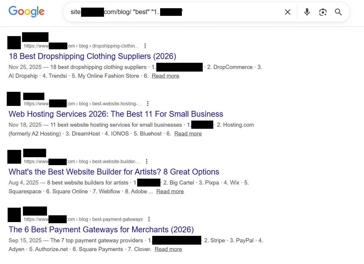Aber ein weiteres Muster stach besonders hervor: Der Blog enthielt genau 191 Self-Promotional Listicles. Gemeint sind damit Artikel, die „beste“ im Titel tragen und das eigene Unternehmen auf Platz 1 setzen. Ja, 191 Artikel sind bei insgesamt rund 30.000 indexierten Blog-Artikeln rechnerisch ein kleiner Anteil. Aber 191 Self-Promotional Listicles fühlen sich eben nicht wie ein Versehen an, sondern wie eine bewusste Strategie.