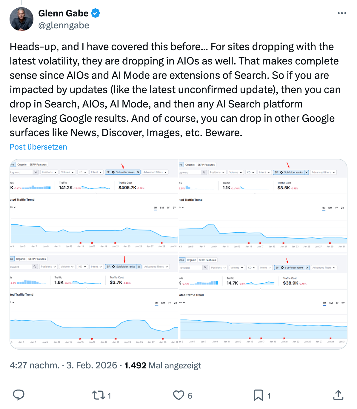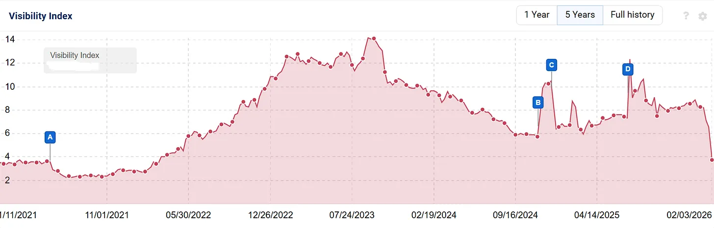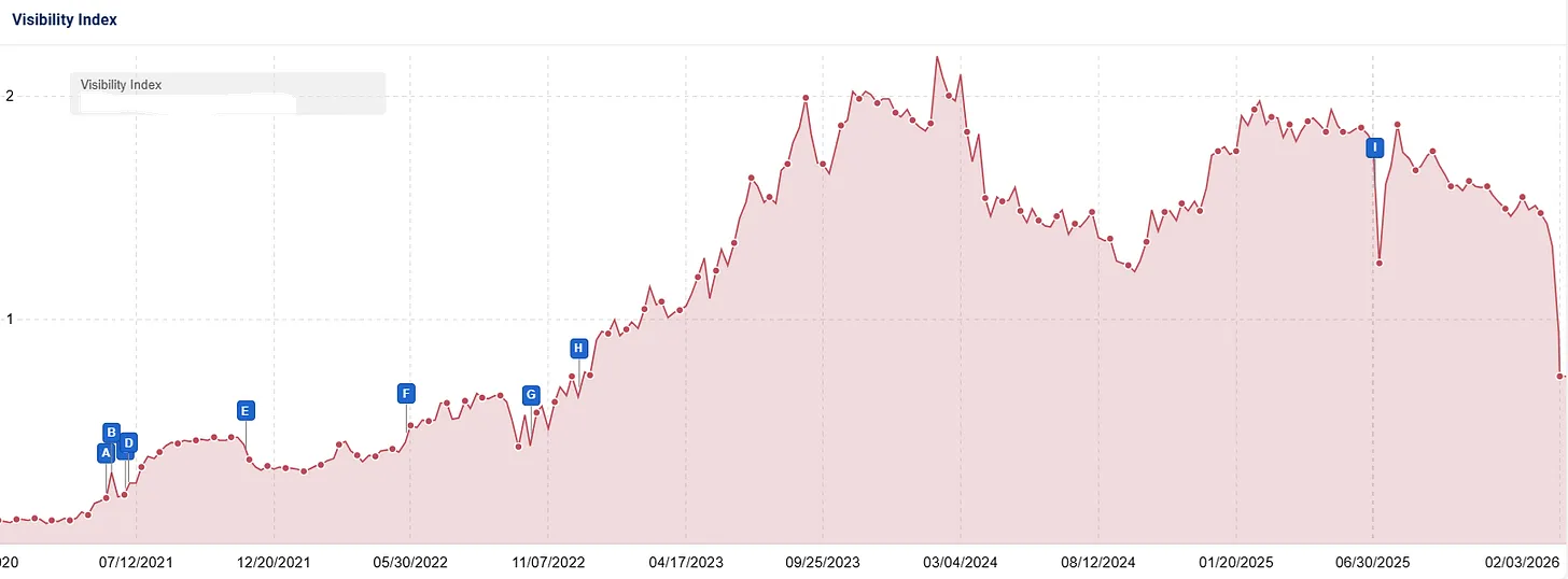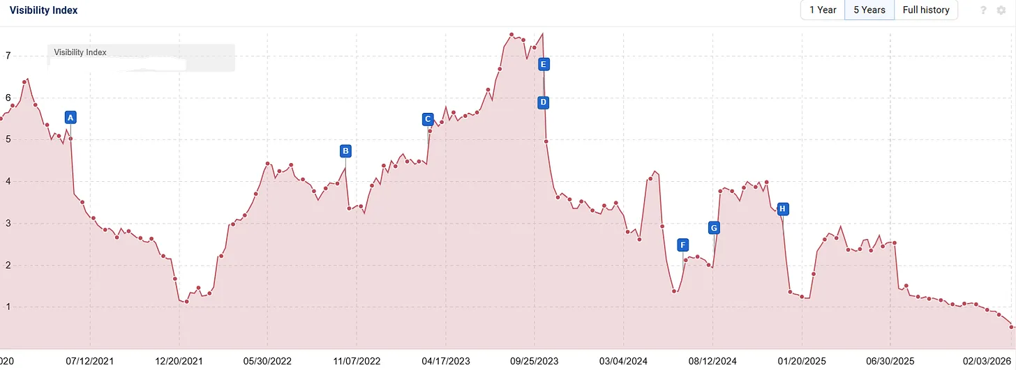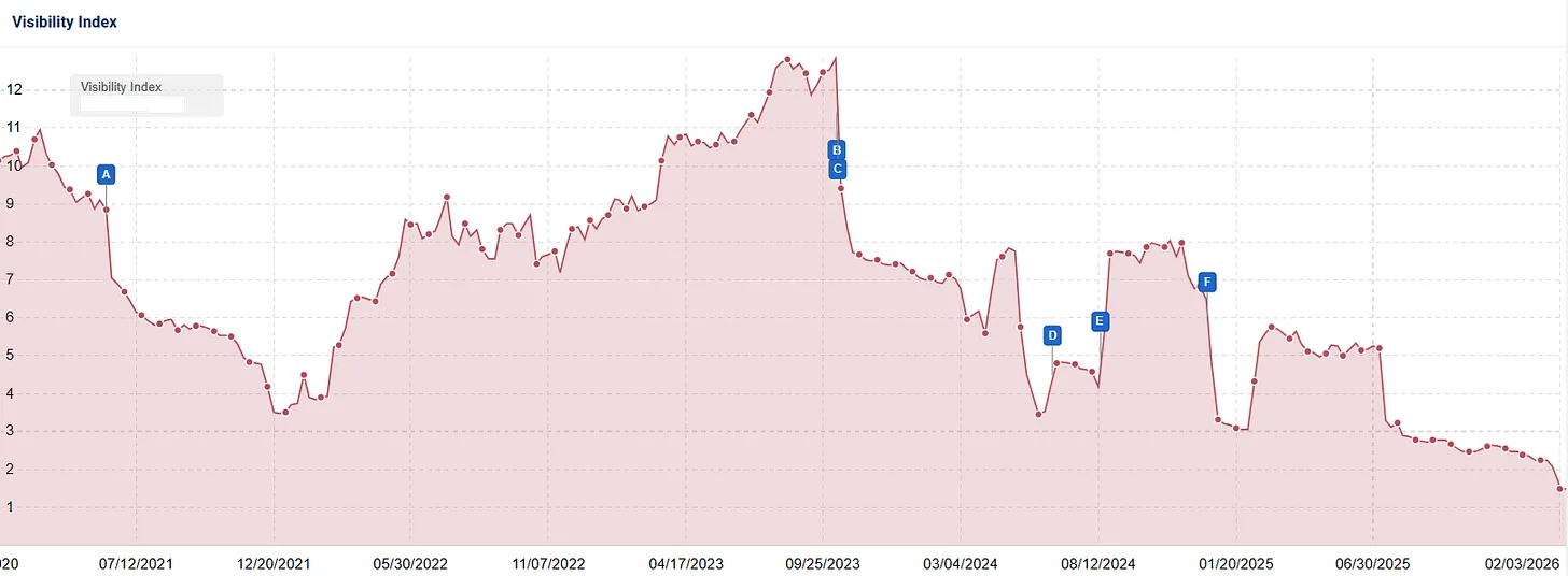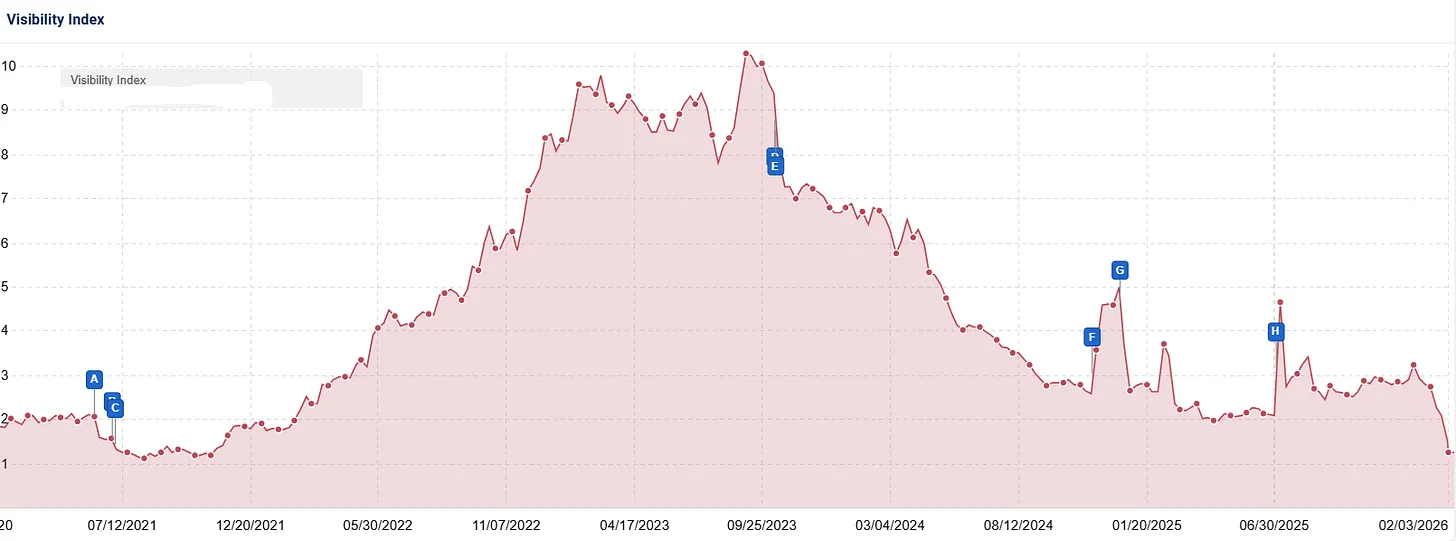 Der Rückgang begann offenbar bereits während des Dezember Core Updates und wurde durch die Ranking-Bewegungen im Januar 2026 weiter verstärkt.