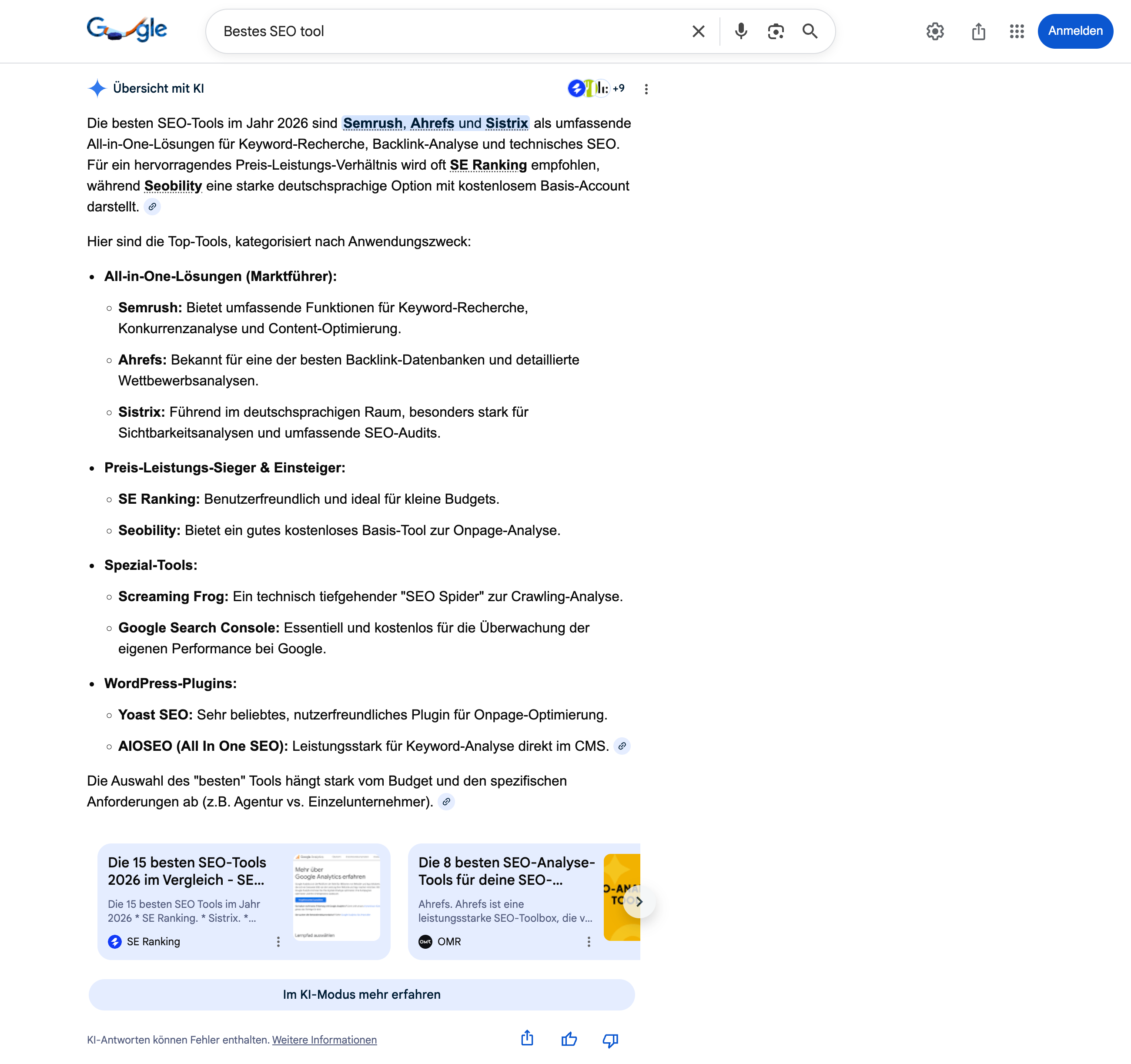 Das Kalkül dahinter war lange Zeit aufgegangen: Suchanfragen mit dem Wort „beste“ priorisieren, sowohl in den organischen Google-Ergebnissen als auch in LLM-Antworten, tendenziell aktuelle Inhalte. Wer seine Listicles regelmäßig mit der aktuellen Jahreszahl im Titel aktualisiert, profitiert von dieser Aktualitätspräferenz doppelt. Viele Unternehmen haben das systematisch genutzt – und damit auch Sichtbarkeit in AI Overviews und anderen KI-Suchantworten gewonnen, die auf Retrieval-Augmented Generation (RAG) basieren.