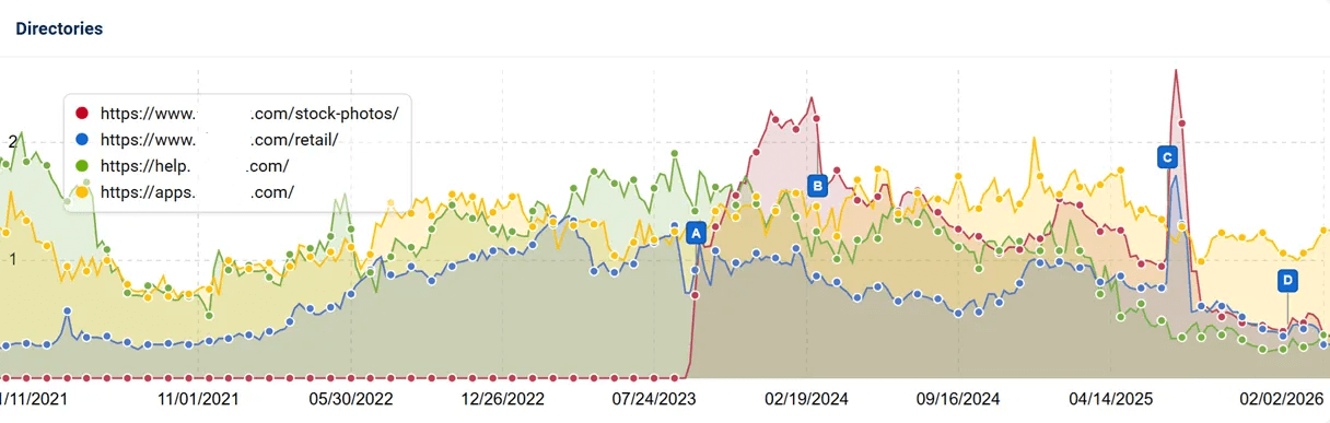 Eine wohl bekannte B2B-Marke verlor zwischen dem 21. Januar und dem 2. Februar 2026 satte 49% ihrer organischen Sichtbarkeit. Der Unternehmensblog macht 77% der gesamten Website-Sichtbarkeit aus und verzeichnete seit Mitte Januar einen massiven Einbruch, während andere Verzeichnisse deutlich geringere Rückgänge oder sogar Gewinne verzeichneten.