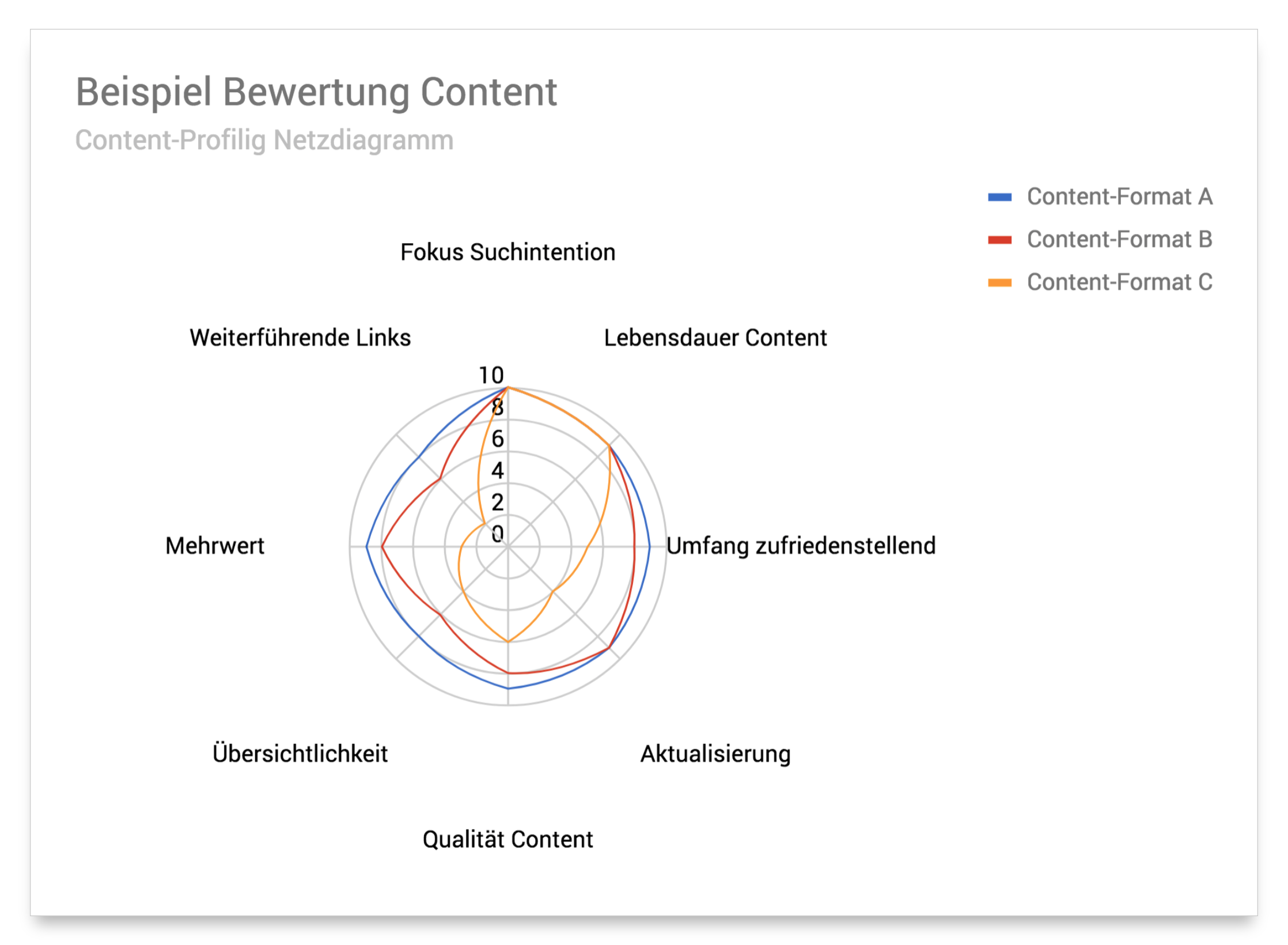 Hat man die die Kriterien für verschiedene Content-Formate bewertet, kann man die Bewertung mit einem Netzdiagramm visualisieren. Auf diese Art werden die Stärken und Schwächen der Formate schnell sichtbar. Für eine übersichtliche Darstellung sollte man die Ausprägungen der einzelnen Kriterien immer so gewählt haben, dass ein hoher Wert besser ist als ein niedriger Wert.