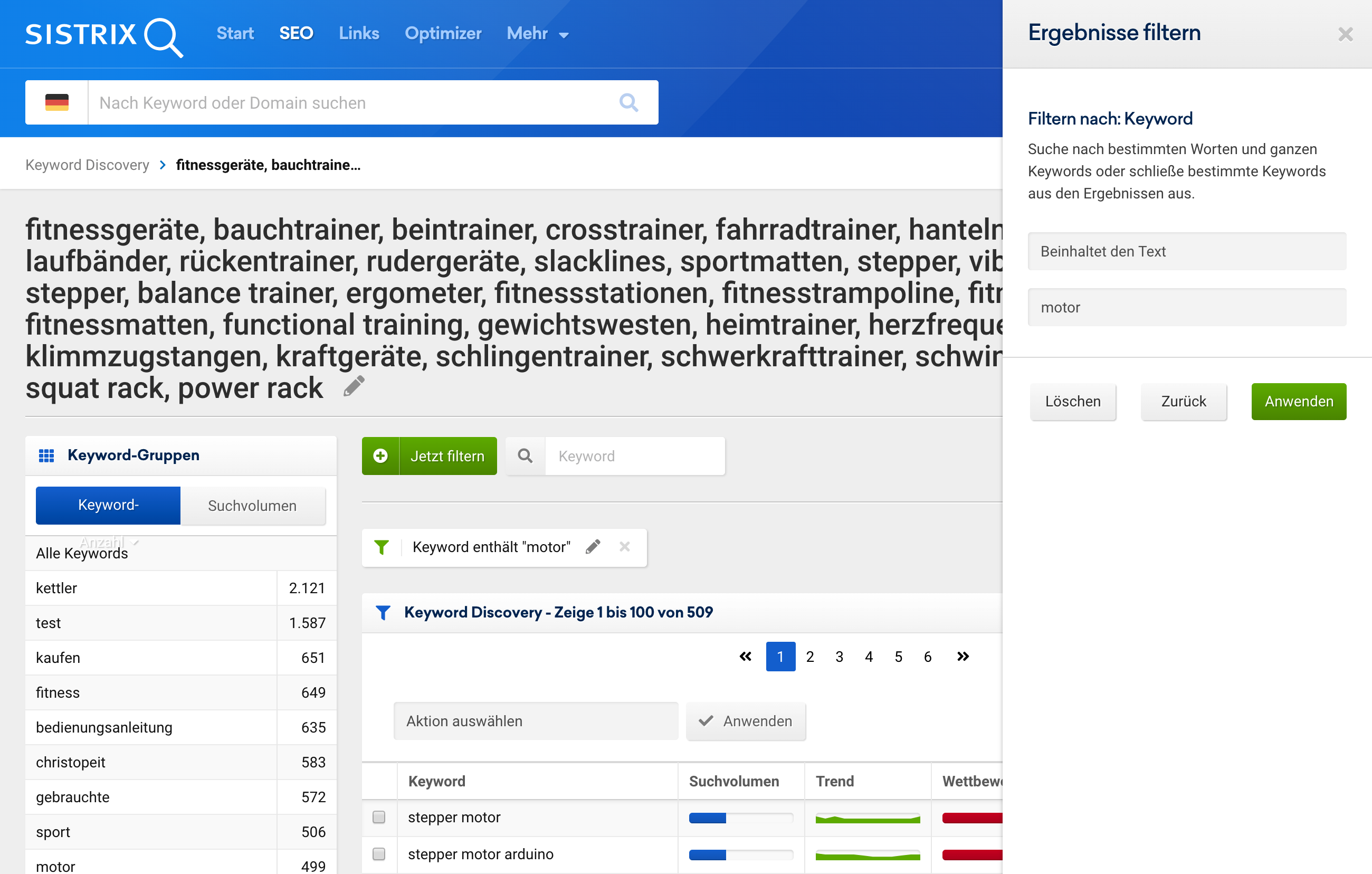 Glücklicherweise kannst Du diese Begriffe schnell ausschließen. Der schnellste Weg: Du nutzt nicht den Wortstamm auf der linken Seite, sondern gibst den Wert in die Filterliste ein: Wenn Du Dir die Liste der Keywords ansiehst, fällt auf, dass der überwiegende Teil sich nicht um Fitness dreht. Mit einem Klick auf das Bearbeiten-Symbol kannst Du jetzt die Logik umkehren. Für alle weiteren Schritte alle Begriffe, die „motor“ enthalten, von der Analyse ausschließen: