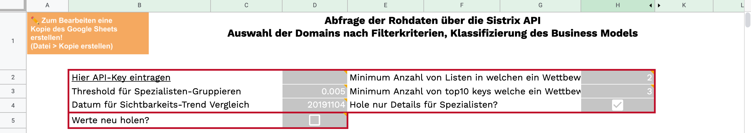 Grau ist alle Theorie. Um es Dir einfacher zu machen mit den Daten zu spielen, habe ich Dir ein Google Sheet erstellt. Mit dessen Hilfe und Deinem SISTRIX-API-Zugang kannst Du die Analyse für Deine Branche nachbauen. Keine Angst, wenn das Sheet am Anfang komplex aussieht. In der Anleitung führe ich Dich Schritt für Schritt durch den gesamten Prozess.