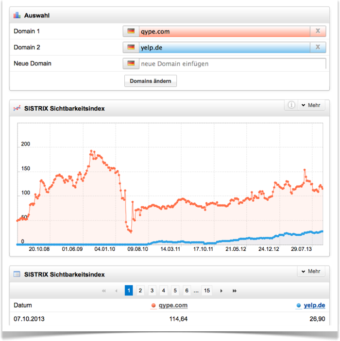 Aktuell besitzt qype.com 114,64 Punkte im Sichtbarkeitsindex und yelp.de 26,90 Punkte. Zusammen wären es rechnerisch derzeit also 141,54 Punkte. Wird der Wert von yelp.de am 18. November darüber oder darunter liegen?