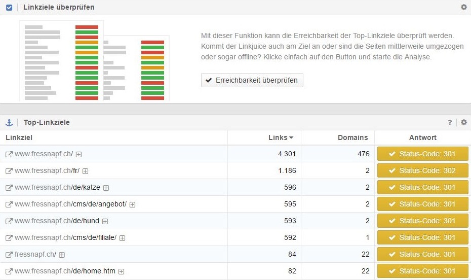 Die Überprüfung der verlinkenden Seiten auf Erreichbarkeit könnte in diesem Fall Aufschluss darüber geben, was noch nicht ganz rund läuft. Auf den ersten Blick wurden die Top-Linkziele per 301 weitergeleitet – so weit so gut. Doch nach stichprobenartiger Kontrolle wohin diese letztendlich führen (mit Klick auf das Quadrat mit dem Pfeil vor der URL) fällt auf, dass überwiegend auf die Startseite fressnapf.ch/de/ verlinkt wurde – ein klassischer Soft-404-Fehler.