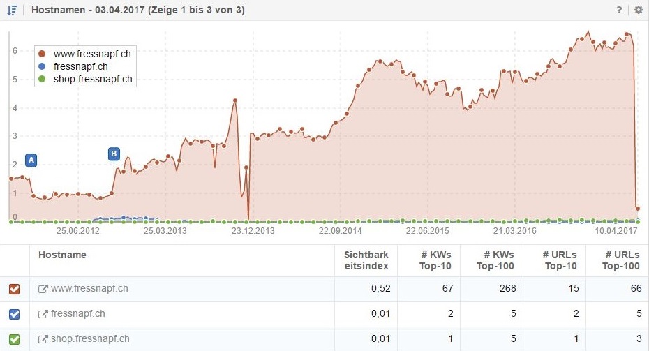 Die Host-Analyse zeigt plastisch, am dargestellten Sichtbarkeitsgraphen, dass der www-Host am 27.03.2017 den Verlust zu verbuchen hat. Zudem scheint sich auch an der Informationsarchitektur etwas zu ändern: So scheint die shop-Subdomain ein wenig Sichtbarkeit dazu zu gewinnen. In wie weit diese sich in den nächsten Wochen entwickeln oder etablieren kann, wird sich zeigen.