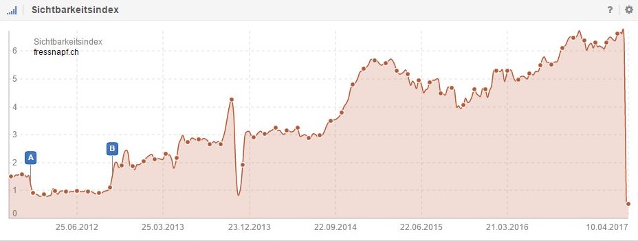 Ein Verlust in der Sichtbarkeit von über 90% ist schmerzhaft, eine Erfahrung die fressnapf.ch aktuell durchleben muss. Die Domain rund um Tiernahrung und -Zubehör fällt in der Schweizer Googlesuche binnen nur 2 Wochen (27.03. auf 10.04.) von 6,2 auf nur noch 0,5 Punkte. 86% der rankenden Keywords und 89% der rankenden URLs verschwinden komplett aus den Top 100 Positionen bei google.ch.