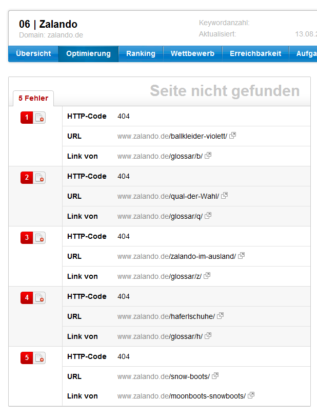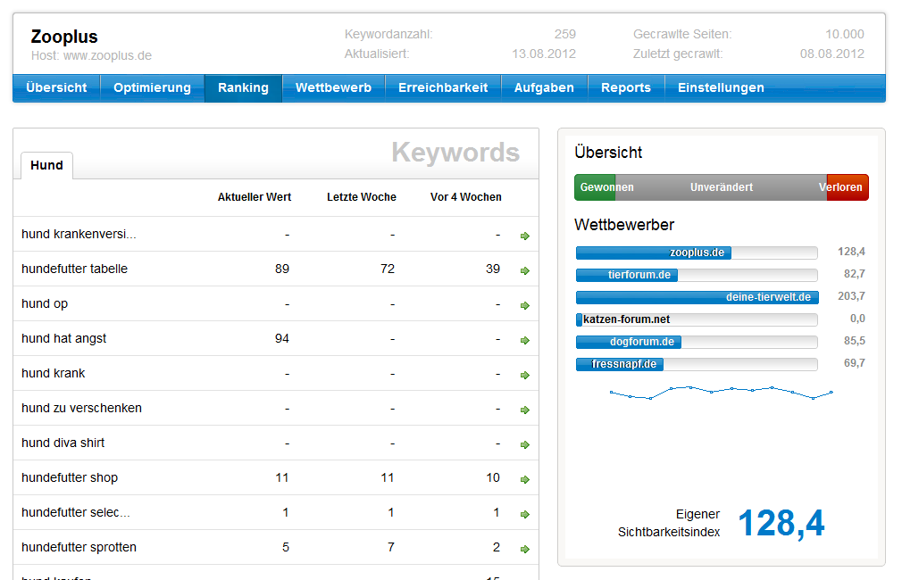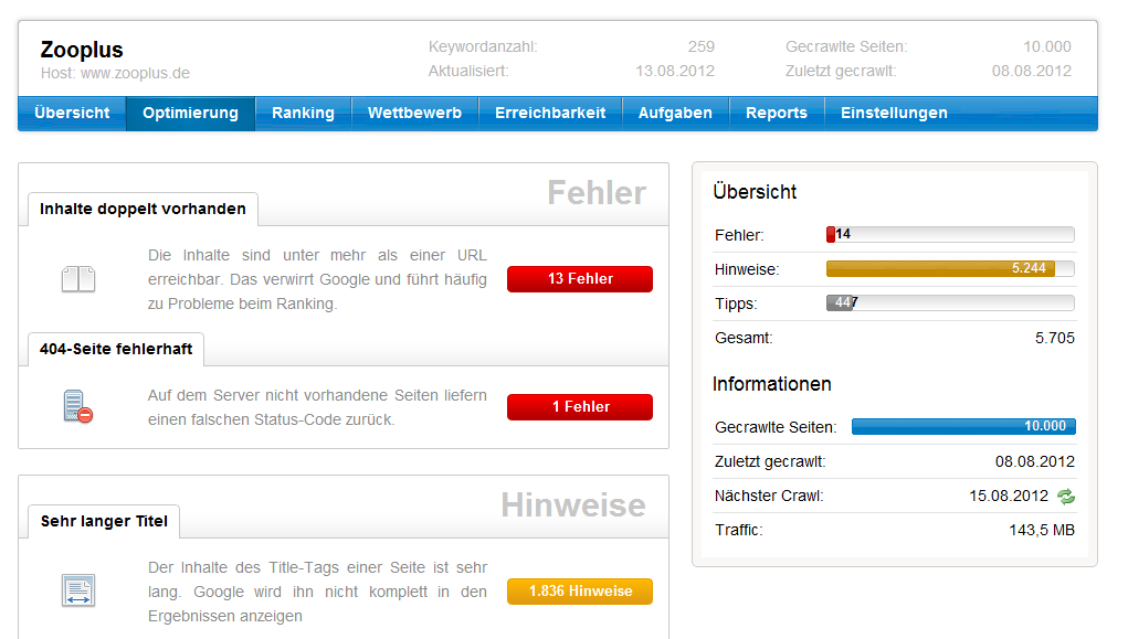 Der Optimizer nimmt viel mühselige Arbeit ab, indem er die Seiten einer Domain crawlt und auf typische SEO-Fehler untersucht. Es dauert nur ein paar Sekunden ein neues Projekt anzulegen und spart damit stundenlange manuelle Arbeit. Wir gehen aber auch einen Schritt weiter und verknüpfen Informationen, die so zwar in der Toolbox bereits häufig vorliegen, deren wahrer Wert aber erst durch die Kombination deutlich wird. So wissen wir zum Beispiel, dass die Domain „zooplus.de“ mit dem Keyword „Mineralfutter“ derzeit auf Position 11 rankt. Auch wissen wir durch unseren Crawler, dass dieses Keyword derzeit zwar auf der Seite zu finden ist, im Title-Tag oder in einer Überschrift aber nicht verwendet wird. Diese Informationen verknüpfen wir nun automatisch und schlagen vor, dass man prüfen sollte, ob das Keyword nicht doch in den Titel aufgenommen werden kann. Häufig reicht das aus, um auf die erste Ergebnisseite bei Google zu gelangen und durch sehr wenig Arbeit mehr Besucher zu erhalten. Diese und zahlreiche weitere Vorschläge bilden eine der Hauptfunktionen des neuen Optimizers. Sie sind individuell auf die jeweilige Domain zugeschnitten und werden regelmäßig aktualisiert. Dadurch, dass wir die Seite wöchentlich neu crawlen, können wir Fehler finden, die auch Schwergewichte der Branche einfach manchmal übersehen.