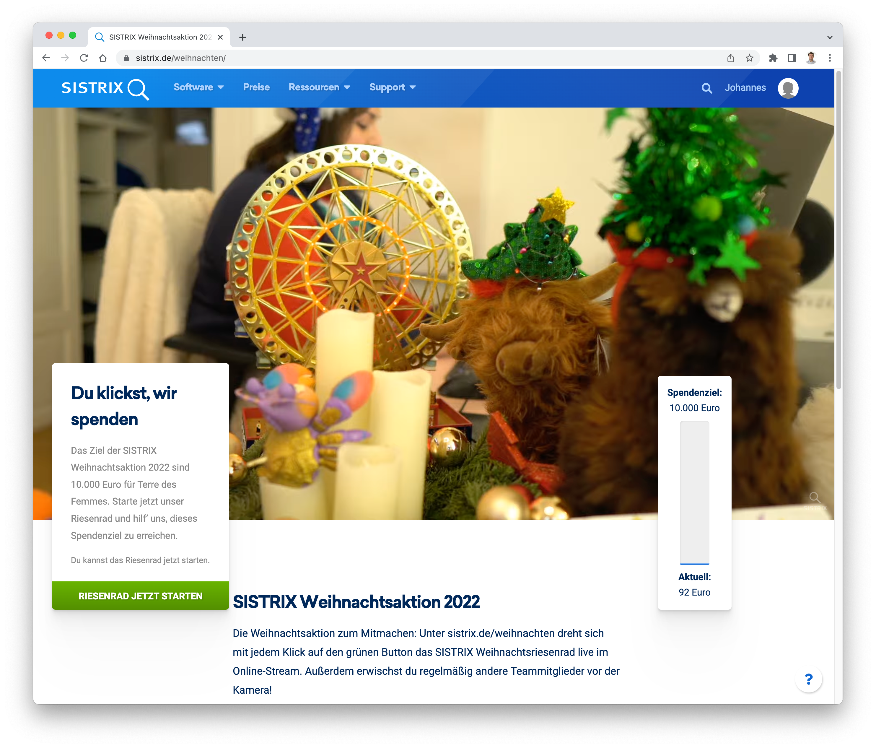 Die Weihnachtsaktion lebt vom Mitmachen. Unter sistrix.de/weihnachten dreht sich mit jedem Klick auf den grünen Button das SISTRIX Weihnachtsriesenrad live im Online-Stream. Außerdem erwischst du regelmäßig andere Mitarbeiter vor der Kamera!