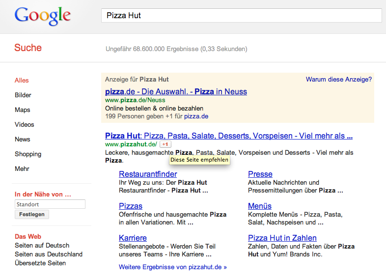 Bleibt also nur eine Schlussfolgerung, dass dieser umstrittene Google Plus Button in den Google SERPS tatsächlich geklickt wird. Ich persönlich hatte hier immer meine Zweifel, denn wer verteilt einen „+1“ für eine Seite, die er zu diesem Zeitpunkt ja noch gar nicht aufgerufen hat oder andersrum, wer sucht eine Seite, findet sie und kehrt dann zu Google zurück um den +1 Button zu drücken. Jetzt weiß ich es, bei Pizza Hut rund 850 User.