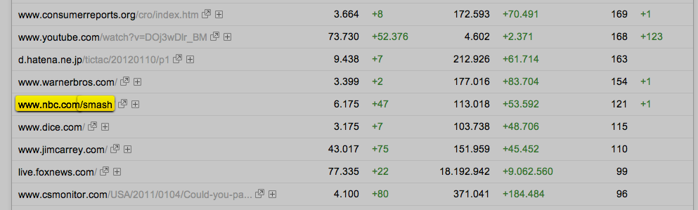 Ein weiteres interessantes Beispiel ist die TV Serie „Smash“ aus den USA. An der Stelle der Hinweis, dass man die Ergebnisse auch nach Land sortieren kann, was sicher noch ganz andere interessante Schlussfolgerungen über die Social Winner zulässt.