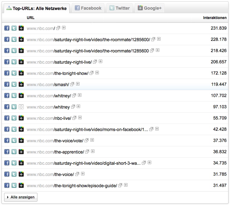 Ein weitere Indiz für den großen Erfolg liefert die Sisitrix Toolbox unter https://de.sistrix.com/nbc.com/social. Die Seite zur Serie gehört im Bereich Social Media zu den Top-URLs auf nbc.com.