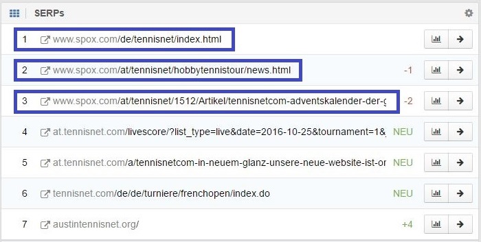 Auch im Bereich ‘Interessante Rankings’ verbirgt sich eine weitere potentielle Stellschraube, die man im Hinblick auf einen optimalen Umzug in Betracht ziehen könnte. Das Keyword “Tennisnet” rankt in den google.at SERPs sowohl für die deutsche als auch für die österreichische Variante auf spox.com.