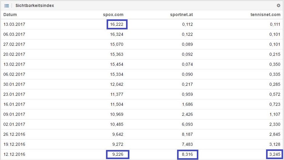 Betrachte man nun beide Domains in einem Vergleich ihrer jeweiligen Sichtbarkeit und legt die Kurven übereinander, ist deutlich erkennbar, dass Mitte Dezember 2016 die Konsolidierung stattgefunden hat, da sportnet.at ab diesem Zeitpunkt verliert und spox.com simultan dazu gewinnt. Von offizieller Seite wurde der Zusammenschluss auch bestätigt (Sportnet wird SPOX Österreich). Spox.com konnte damit knapp 60% an Sichtbarkeit (von 9,3 auf 16,2 Punkten) gut machen.