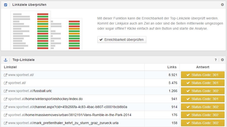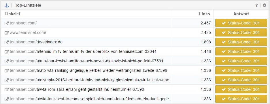 Wirft man einen kurzen Blick auf die Backlinks und prüft die Top-Linkziele von sportnet.at und tennisnet.com auf ihre Verfügbarkeit sowie die hinterlegten Status-Codes, so wurde größtenteils mit der 301-Weiterleitung gearbeitet (vereinzelt jedoch auch mit 302-Weiterleitungen – vor allem bei sportnet.at). Allerdings sollte die Weiterleitung auch inhaltlich & thematisch passend durchgeführt werden, sodass der Linkjuice weiterhin optimal vererbt werden kann – die Weiterleitung der Links auf das tennisnet-Verzeichnis (und nicht auf die inhaltlich passenden Unterverzeichnisse) stellt eine schlechte User Experience dar und wird von Google als soft 404 betrachtet. Gleiches lässt sich auch für die Weiterleitung der Links von sportnet.at sagen – diese wurden ebenso lediglich auf die österreichische Startseite spox.com/at/ platziert.