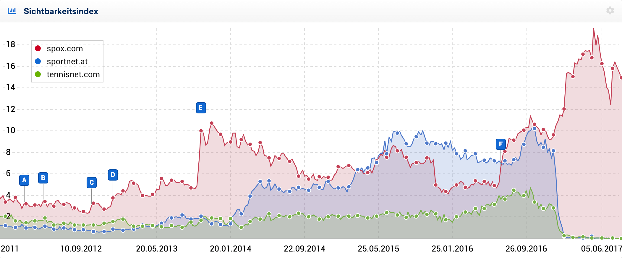 Doch sportnet.at ist nicht die einzige Domain, welche sich SPOX angeschlossen hat. Auch tennisnet.com verliert im selben Zeitraum in google.at merklich an Sichtbarkeit – diese Inhalte wurden ebenfalls auf spox.com übertragen (SPOX und tennisnet: We are One!).