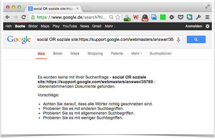 Das Ergebnis ist eindeutig. Die Wörter „Social“ oder „Soziale“ kommen nicht in den Google Richtlinien vor. Diese Aussage lässt sich auf den Google-Algorithmus übertragen. Sollten Social Signals ein bedeutender und direkter Rankingfaktor sein, kann man mit an Sicherheit grenzender Wahrscheinlichkeit davon ausgehen, dass Google in seinen Richtlinien Social-Media-Spam untersagt.