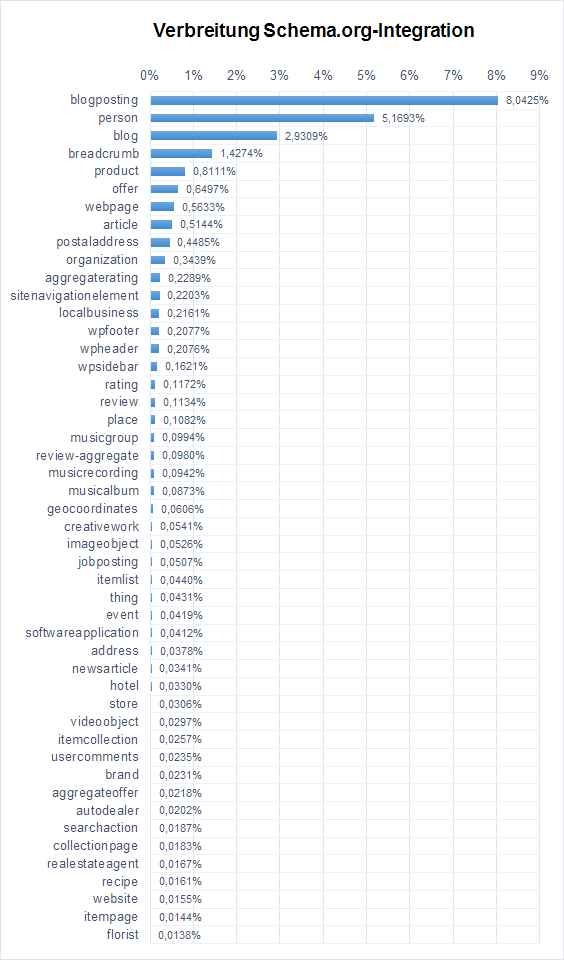 Es gibt vier Typen, die auf mehr als 1 Prozent aller gecrawlter URLs zu finden waren. Blogposting und Blog sind auch dadurch stark vertreten, dass die großen Bloghosting-Dienste wie blogger.com & blogspot.com (beides von Google) diese Auszeichnung unterstützen. Eng damit im Zusammenhang steht Person als Schema.org-Typ: auch diesen nutzt Google intensiv, beispielsweise auf allen GooglePlus-Seiten. Die Popularität von Breadcrumb hängt vermutlich damit zusammen, dass man durch diese Auszeichnung eine schöne Anzeige in den Google-Ergebnissen erhält. Dass es für kostenlose CMS wie WordPress zahlreiche kostenlose und einfache Plugins dafür gibt, dürfte auch nicht schaden.