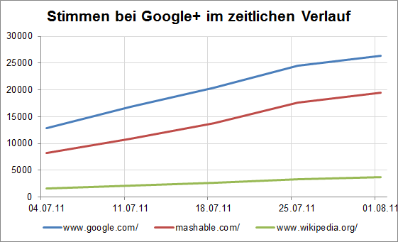 Es ist jetzt über einen Monat her, dass Google mit Google Plus seinen Facebook-Konkurrenten gestartet hat. Das Medienecho war überwältigend, noch jetzt werden täglich Aspekte und Hintergründe des Google-Dienstes beleuchtet. Beobachte ich meine Inbox mit den Meldungen, die Google verschickt, wenn mich jemand in einen seiner Circles aufnimmt, scheint das Wachstum von Google Plus derzeit noch an Fahrt zuzulegen. Um das etwas genauer zu beobachten, möchte ich in diesem Posting zwei Auswertungen zu Google Plus vorstellen: zum einen beobachten wir seit Start von Google Plus die Anzahl der Stimmen für eine ganze Reihe von URLs. In den SISTRIX Labs gibt es im Rahmen der Top-URLs sowie der Gewinner der Woche bereits einen Einblick in die Daten. Hier das Wachstum der Stimmen für 3 interessante URLs: