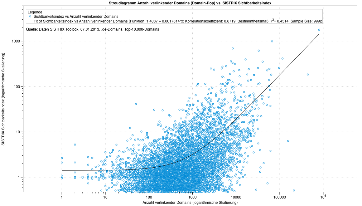 Für die erste Grafik wurde eine Korrelation von 0,67 errechnet.und das Bestimmtheitsmaß beträgt damit R^2=0,45. Bei der zweiten Grafik liegt die Korrelation bei 0,59 und das Bestimmtheitsmaß sinkt auf R^2=0,35. Anders ausgedrückt können bei der untersuchten Stichprobe die Domain-Pop-Werte 45 Prozent der Streuung im Sichtbarkeitsindex erklären, während die reine Anzahl Links nur 35 Prozent erklären. Der Unterschied ist so deutlich, dass bestätigt wird, dass die Domain-Pop die bessere Kennzahl für SEO-Analysen ist.
