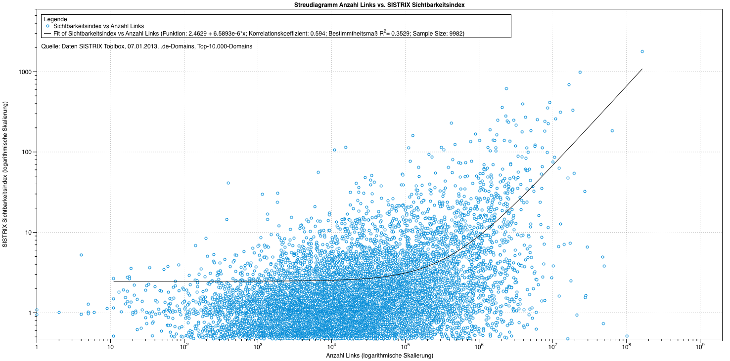 Im letzten Beitrag wurde der Zusammenhang zwischen Anzahl verlinkender Domains (Domain Popularity bzw. Domain-Pop) und Sichtbarkeitsindex in Form eines Streudiagramms visualisiert. Heute möchte ich zeigen, wie sich das Streudiagramm verändert, wenn man den Faktor Domain-Pop durch die reine Anzahl Links austauscht. Die Stichprobenauswahl bleibt gegenüber der ersten Analyse unverändert.