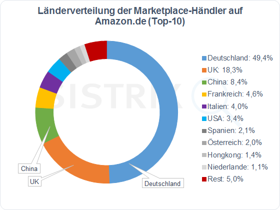Gut zu sehen, dass die meisten aktiven Händler nur sehr wenige Produkte im Sortiment haben. 22 Prozent der Händler sogar nur maximal 10 Produkte. Mehr als die Hälfte aller Amazon-Händler (53%) haben maximal 100 Produkte im Angebot. Nur 16% der Marketplace-Händler haben mehr als 1.000 Produkte im Sortiment. In der nächsten Auswertung geht es um die Ursprungsländer dieser Händler:
