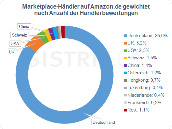Nur knapp die Hälfte aller aktiven Marketplace-Händler auf amazon.de sitzen derzeit in Deutschland. Auf Platz zwei folgt das Vereinigte Königreich mit 18,3% der Händler und danach bereits China mit 8,4%. Der geringe Anteil der Händler aus Deutschland überrascht auf den ersten Blick, wird aber durch Auswertungen wie diese von wortfilter.de bestätigt. Trotzdem zeigen diese Zahlen nur die halbe Wahrheit: alle Händler haben, unabhängig von ihrem Absatz und Angebot den gleichen Einfluss auf diese Auswertung. Um dies zu korrigieren, habe ich diese Auswertung erneut gemacht – dieses Mal allerdings gewichtet mit der Anzahl der Händlerbewertungen. Diese können als grober und genereller Maßstab für den Absatz der Händler angesehen werden: