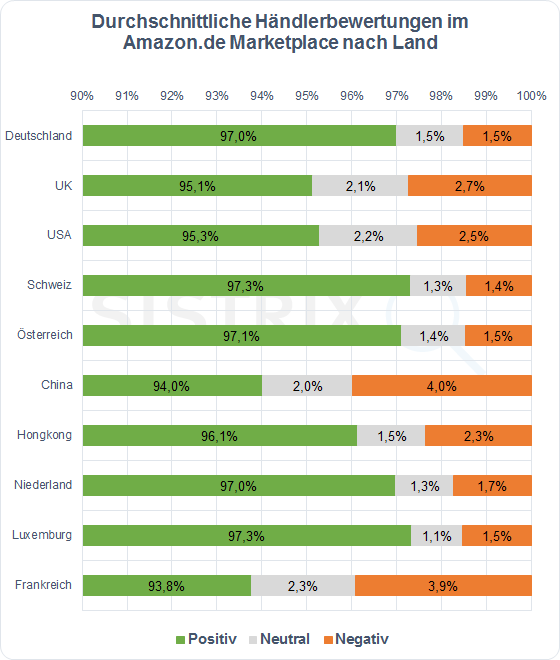 Von den rund 80 Millionen gemessenen Händlerfeedbacks sind fast 97% positiv. Nur 1,5% der Feedbacks sind neutral und nur wenig mehr, 1,6%, der Händlerfeedbacks sind negativ. Im Umkehrschluss bedeutet das natürlich, dass sich Händler gar keine andere Bewertung als „positiv“ leisten können. Als abschließende Auswertung habe ich diese Verteilung nun ebenfalls auf die Händlerländer heruntergebrochen (Vorsicht, die Skala fängt oben erst bei 90% an):