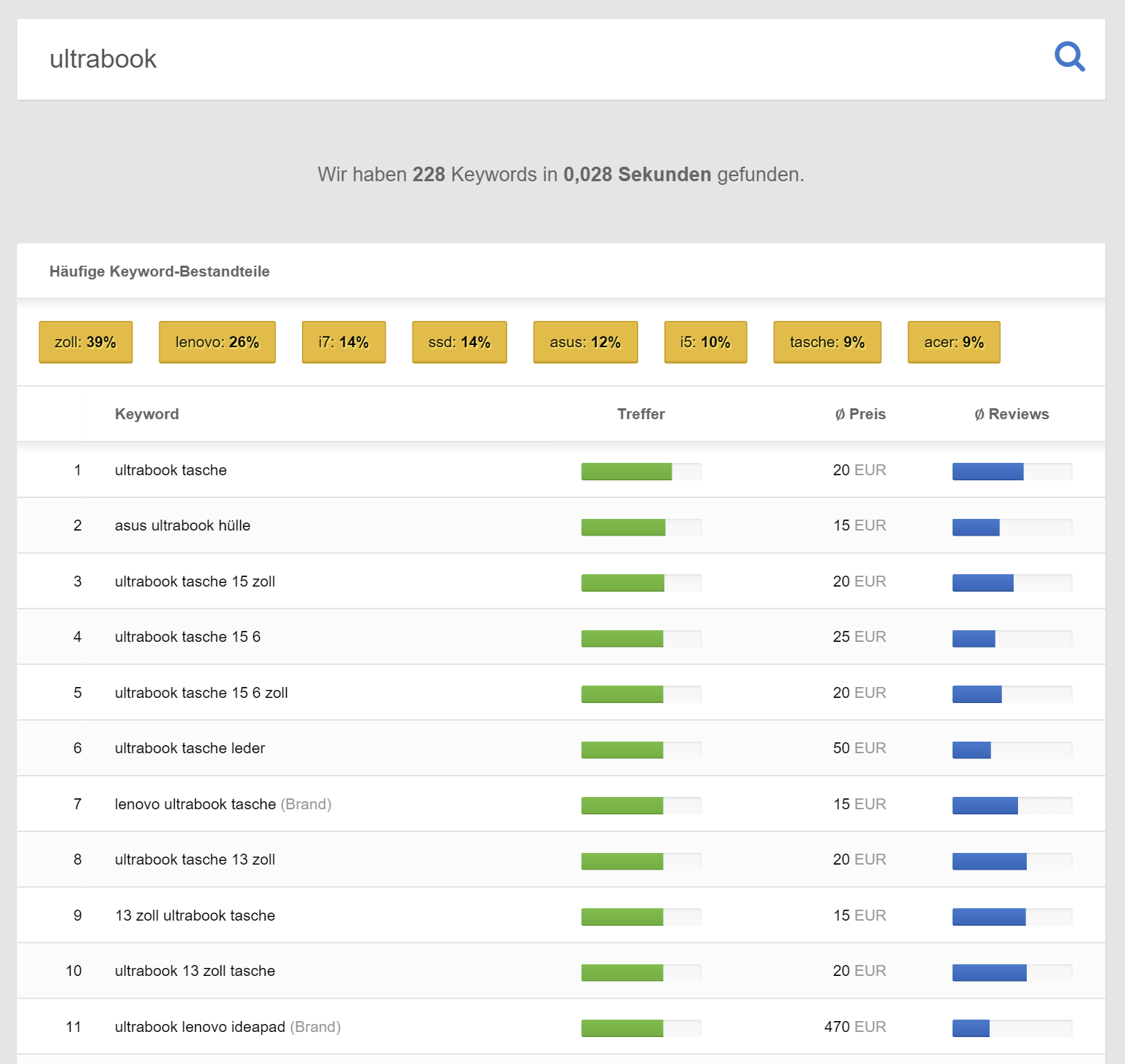 Naturgemäß ist das Suchverhalten bei Amazon anders als bei Google: das fängt damit an, dass der Suchende in der Regel eine konkrete Kaufintention hat, führt über ein anderes SERP-Layout und endet letztlich doch immer wieder beim Keyword selber. Um in diesen Teil der Plattform etwas Transparenz zu bringen, haben wir eine Keyword-Datenbank für Amazon aufgebaut. In diesem Amazon Keyword Tool haben wir mehrere Millionen typischer Suchanfragen an die Amazon-Suche gesammelt. Ein beispielhaftes Ergebnis sieht so aus: