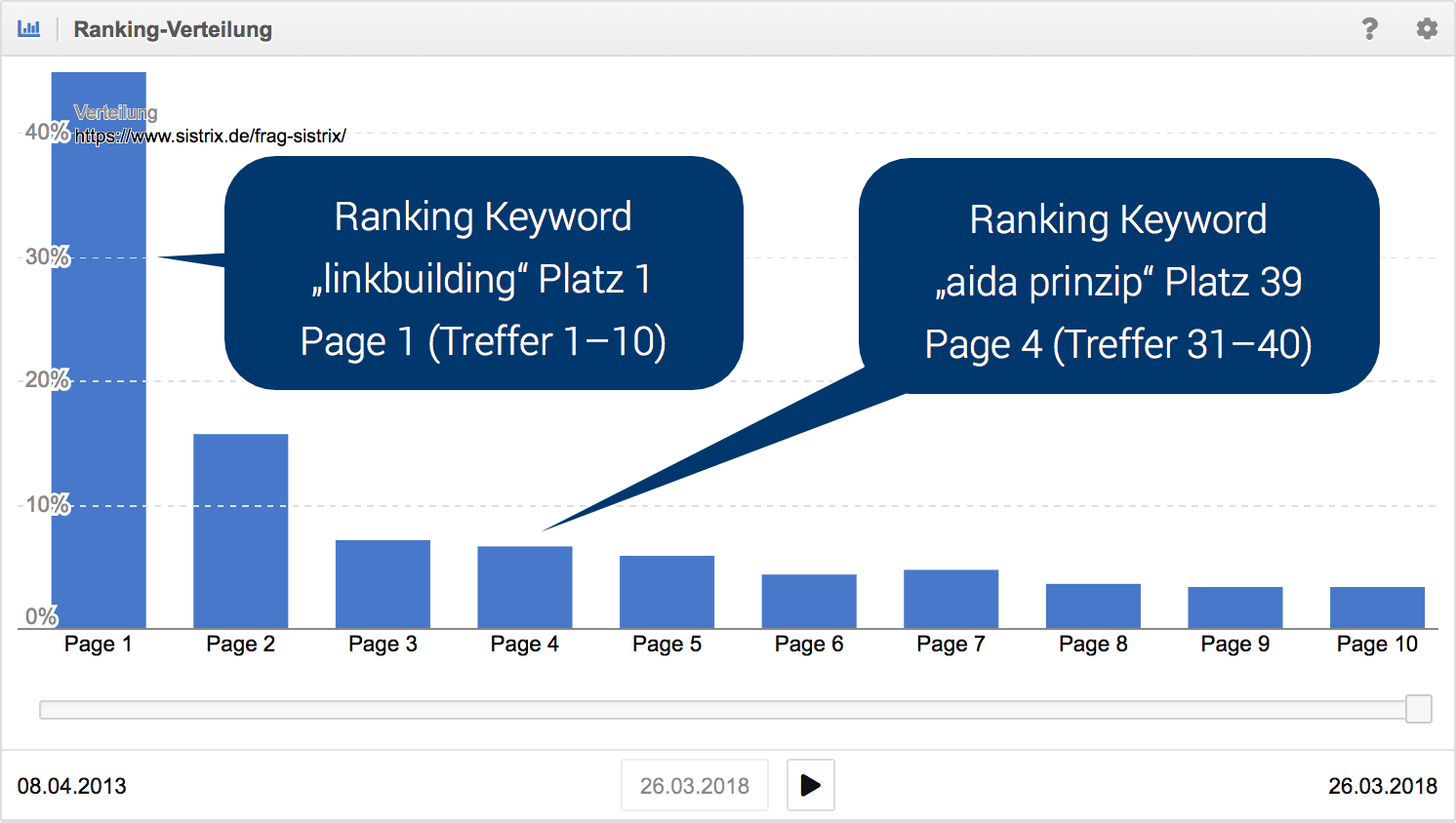 Beispiel Zuordnung Rankings in die Ranking-Verteilung: Ein Ranking auf Platz 1 wird der 1. Suchergebnisseite (Page 1) zugeordent und ein Ranking auf Platz 39 der 4. Suchergebnisseite (Page 4).