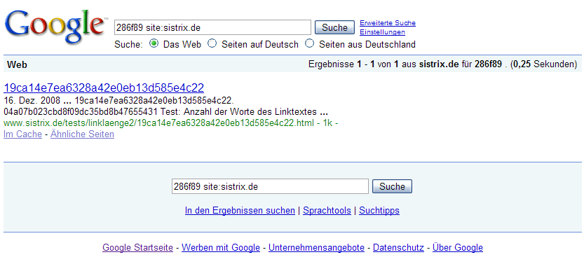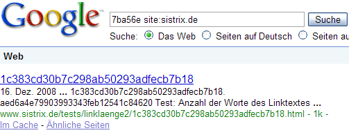 Nachdem der Test aus dem letzten Posting ja zu keinem definitiven Ergebnis geführt hat, habe ich einen neuen Test gemacht und glaube, die Antwort jetzt gefunden zu haben. Wie vor ein paar Tagen, habe ich auch dieses mal ein paar Seiten und Links erstellt und wollte damit rausfinden, wie lang ein Linktext denn nun sein darf. Da der letzte Test gezeigt hat, dass die reine Länge des Linktextes kein begrenzender Faktor ist, habe ich dieses Mal die Anzahl der Worte im Linktext getestet, hier online zu sehen. Bei 8 Worten beziehungsweise 7 Leerzeichen wird die Zielseite noch mit dem letzten Linktext gefunden:
